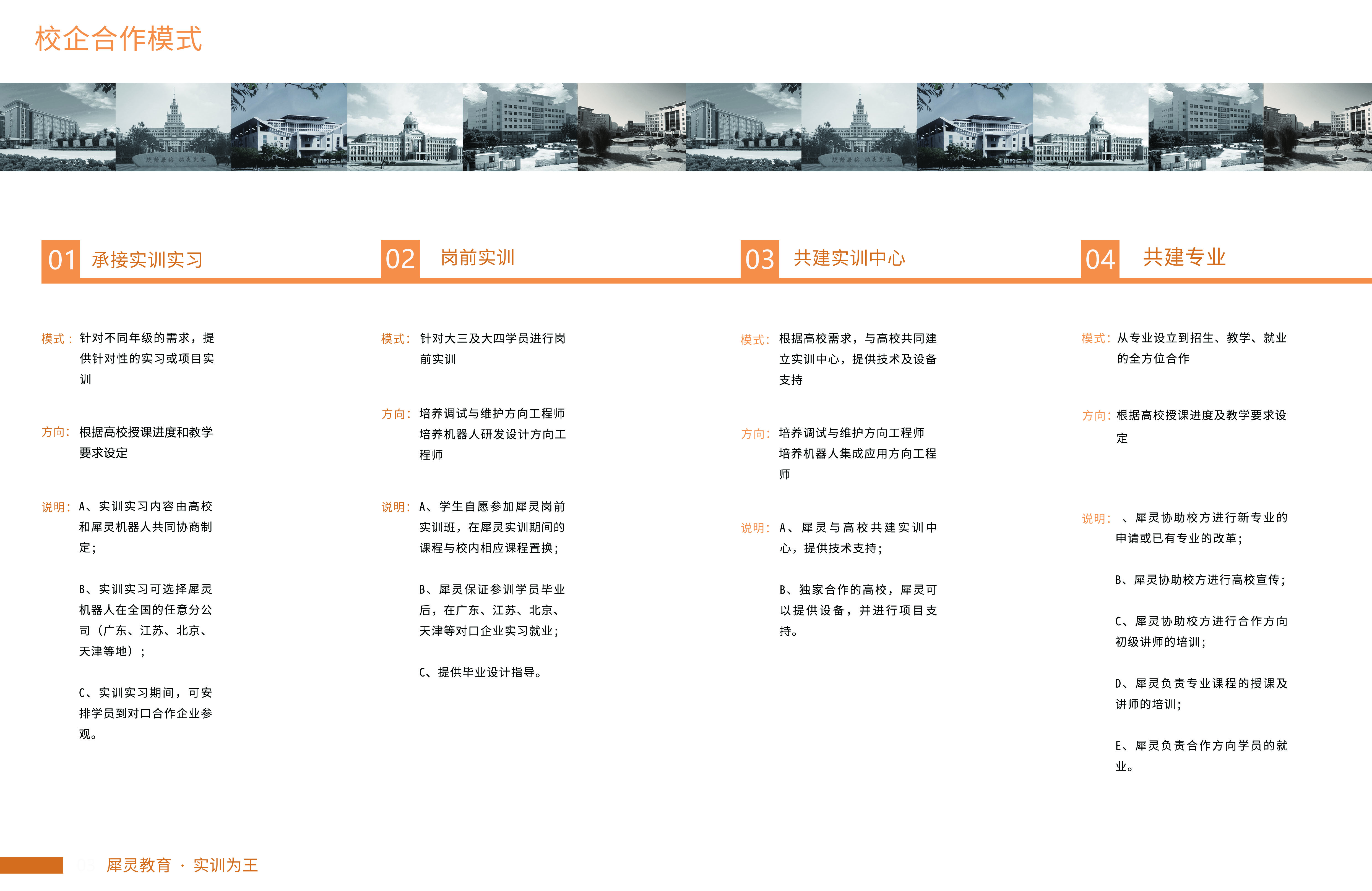 犀靈機(jī)器人秉承“互利共嬴”的宗旨和“共建精品專(zhuān)業(yè)”的教育與產(chǎn)業(yè)整合理念,推行校企合作的人才培養(yǎng)模式。在校企合作方面,犀靈機(jī)器人與校方發(fā)揮各自?xún)?yōu)勢(shì),聯(lián)合培養(yǎng)高新技術(shù)綜合型人才;在專(zhuān)業(yè)共建方面,犀靈機(jī)器人與國(guó)內(nèi)本、專(zhuān)科以及職業(yè)院校共建包括工業(yè)機(jī)器人技術(shù)專(zhuān)業(yè)、機(jī)器視覺(jué)專(zhuān)業(yè)等在內(nèi)的專(zhuān)業(yè)體系,涵蓋人才培養(yǎng)方案設(shè)計(jì)、課程體系建設(shè)、實(shí)訓(xùn)體系建設(shè)、師資隊(duì)伍建設(shè)、學(xué)生實(shí)習(xí)就業(yè)、配套基礎(chǔ)建設(shè)等方面合作;同時(shí),在保障學(xué)生優(yōu)質(zhì)化就業(yè)的前提下,犀靈機(jī)器人創(chuàng)新性的提出“項(xiàng)目導(dǎo)向制教學(xué)”、“以就業(yè)為導(dǎo)向的實(shí)踐教學(xué)”、“教學(xué)安排基于行業(yè)崗位標(biāo)準(zhǔn)”、“線(xiàn)上線(xiàn)下混合式教學(xué)模式”等符合現(xiàn)代職業(yè)教育發(fā)展的教學(xué)理念,并貫穿應(yīng)用在學(xué)生教學(xué)、學(xué)生管理、實(shí)訓(xùn)實(shí)習(xí)的全過(guò)程。