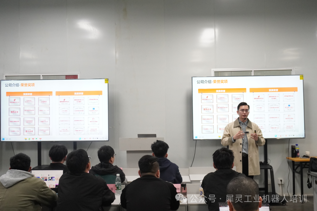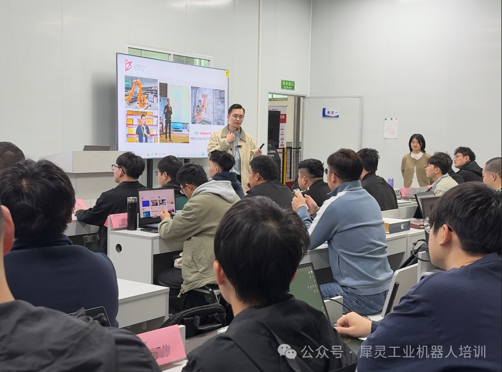 課程開啟后,“大班理論 + 小班實操” 的優(yōu)勢充分顯現(xiàn)。理論課堂上,講師借助雙屏展示企業(yè)榮譽、技術(shù)案例,結(jié)合行業(yè)前沿動態(tài),構(gòu)建起完整的知識體系。從機器人基礎(chǔ)原理到自動化項目設(shè)計邏輯,學(xué)員們專注記錄、積極互動,思維在專業(yè)知識的碰撞中不斷升級。