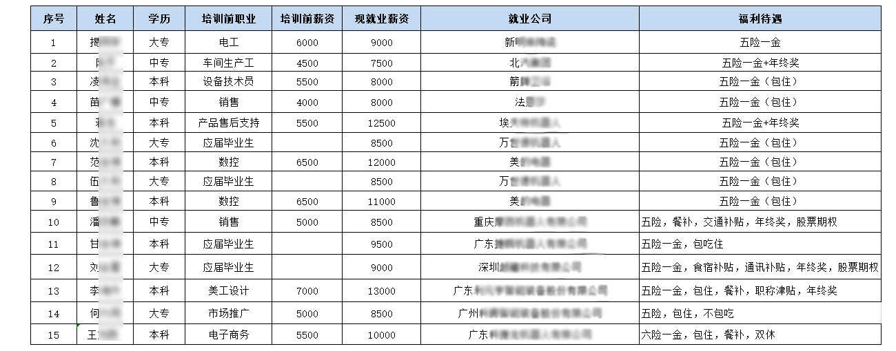 第3期學員2017年6.12號畢業(yè),共15位學員,截止2019年3.1日,平均薪金為9566元,最讓人振奮的是他們居然100%還在從事著與工業(yè)機器人相關(guān)的工作。