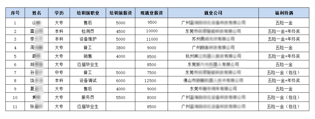 第6期學(xué)員2017年11.12號(hào)畢業(yè),共11位學(xué)員,截止2019年3.1日,平均薪金為9272元,最讓人振奮的是他們居然100%還在從事著與工業(yè)機(jī)器人相關(guān)的工作。