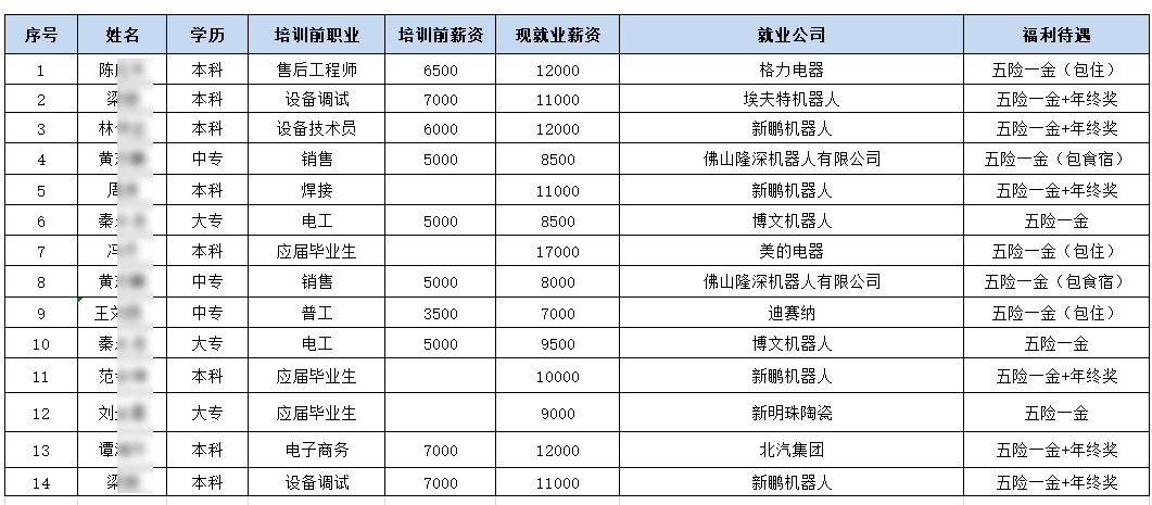 第一期學員2017年4.10號畢業(yè),共14位學員,截止2019年2.23日,平均薪金為10464元,最讓人振奮的是他們居然100%還在從事著與工業(yè)機器人相關的工作。