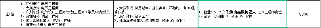 王*建同學(xué),33歲,內(nèi)蒙古科技大學(xué)測控技術(shù)與儀器專業(yè)本科,8年工作經(jīng)驗(yàn),王同學(xué)非??春弥悄苤圃煨袠I(yè)的未來前景,希望通過學(xué)習(xí)工業(yè)機(jī)器人系統(tǒng)集成課程轉(zhuǎn)型電氣工程師。通過努力,成功入職嘉騰機(jī)器人電氣工程師一職,轉(zhuǎn)正月薪10000元,雙休,另有加班費(fèi)和出差補(bǔ)貼。