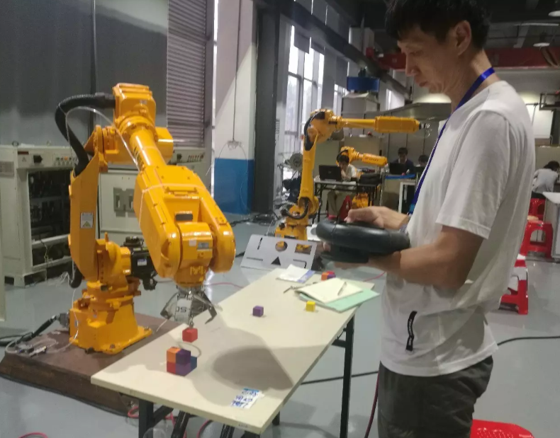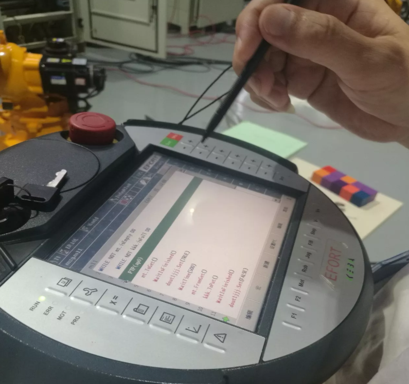 ▲ 大叔通過(guò)調(diào)試示教盒運(yùn)行機(jī)器人進(jìn)行拆垛碼垛