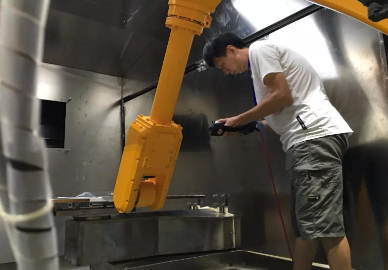 ▲ 大叔在噴涂工作站進(jìn)行示教關(guān)節(jié)臂的標(biāo)定工作