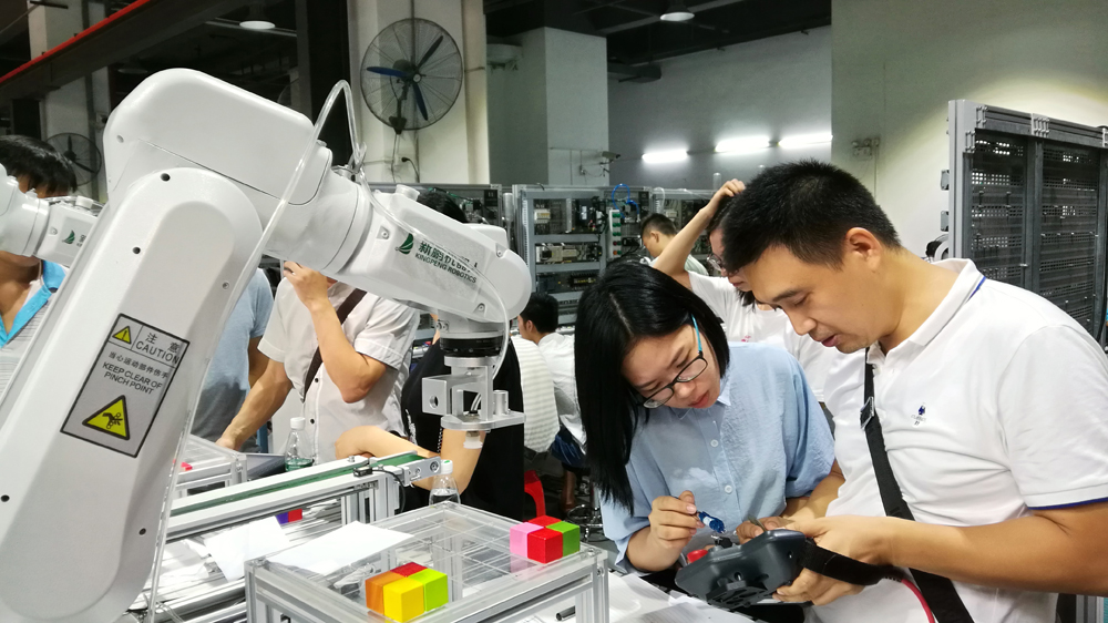 在隨后的幾天,骨干教師們就進(jìn)入到機(jī)器人的實(shí)踐學(xué)習(xí)中。40多位老師分成多組,在犀靈機(jī)器人培訓(xùn)中心將進(jìn)行相關(guān)的工業(yè)機(jī)器人集成項(xiàng)目設(shè)計(jì)。課程由犀靈的陳老師以理論與實(shí)踐相結(jié)合的方式進(jìn)行講授,教師們認(rèn)為課程系統(tǒng)且有深度,能夠從中學(xué)到較多實(shí)用的東西。
