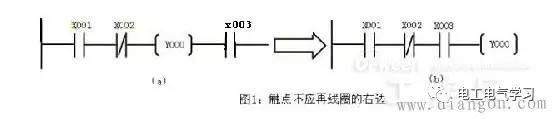 一,梯形階梯都是始于左母線,終于右母線(通常可以省掉不畫(huà),僅畫(huà)左母線)。每行的左邊是接點(diǎn)組合,表示驅(qū)動(dòng)邏輯線圈的條件,而表示結(jié)果的邏輯線圈只能接在右邊的母線上。接點(diǎn)不能出現(xiàn)在線圈右邊。如下圖(a)應(yīng)改為(b):