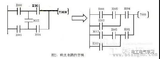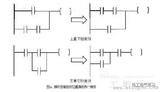 三,并聯(lián)塊串聯(lián)時(shí),應(yīng)將接點(diǎn)多的去路放在梯形圖左方(左重右輕原則);串聯(lián)塊并聯(lián)時(shí),應(yīng)將接點(diǎn)多的并聯(lián)去路放在梯形圖的上方(上重下輕的原則)。這樣做,程序簡(jiǎn)潔,從而減少指令的掃描時(shí)間,這對(duì)于一些大型的程序尤為重要。如下圖所示: