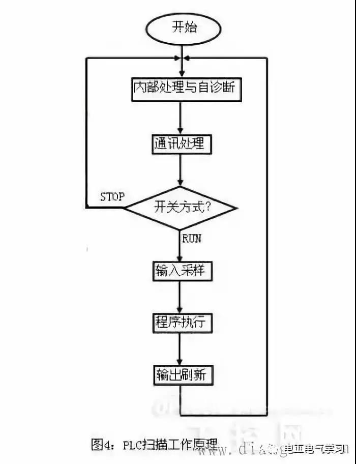 PLC的CPU采用循環(huán)掃描的工作方式。一般包括五個(gè)階段(如圖所示):內(nèi)部診斷與處理,與外設(shè)進(jìn)行通訊,輸入采樣,用戶(hù)程序執(zhí)行和輸出刷新。當(dāng)方式開(kāi)關(guān)處于STOP時(shí),只執(zhí)行前兩個(gè)階段:內(nèi)部診斷與處理,與外設(shè)進(jìn)行通訊。