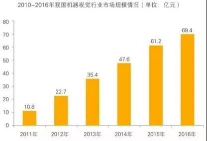 中國機器視覺起步于80年代的技術(shù)引進,隨著98年半導(dǎo)體工廠的整線引進,也帶入機器視覺系統(tǒng),06年以前國內(nèi)機器視覺產(chǎn)品主要集中在外資制造企業(yè),規(guī)模都較小,06年開始,工業(yè)機器視覺應(yīng)用的客戶群開始擴大到印刷、食品等檢測領(lǐng)域,2011年市場開始高速增長,隨著人工成本的增加和制造業(yè)的升級需求,加上計算機視覺技術(shù)的快速發(fā)展,越來越多機器視覺方案滲透到各領(lǐng)域,到2016年我國機器視覺市場規(guī)模已達近70億元。