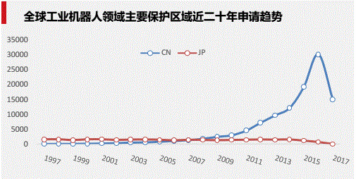 工業(yè)機器人主要專利保護區(qū)域近二十年申請趨勢