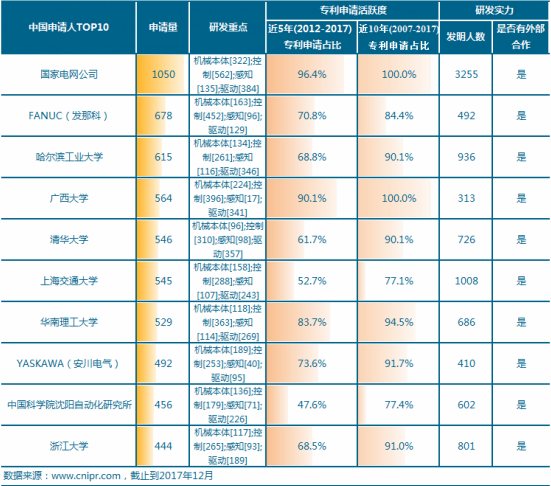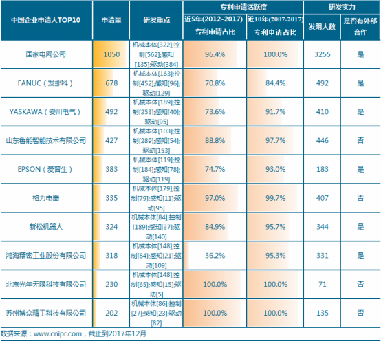 申請量排名前10的企業(yè)中,剔除失效專利、高校申請專利以及國家電網(wǎng)申請的專利,排名第二、第三和第五的分別為日本的發(fā)那科、安川電機和愛普生,插入其中的唯有一家中國企業(yè)—山東魯能智能技術(shù)有限公司,余下依次為格力電器、新松機器人、鴻海精密工業(yè)股份有限公司、北京光年無限科技有限公司、蘇州博眾精工有限公司。