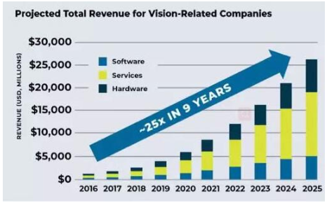 預(yù)計這些增加的活動將轉(zhuǎn)化為收入的增加;例如,Tractica最近發(fā)布的一份市場研究報告預(yù)測,從現(xiàn)在到2025年,計算機(jī)視覺市場(包括硬件、軟件和服務(wù),見圖1c)的收入將增加25倍,到2025年將超過260億美元。
