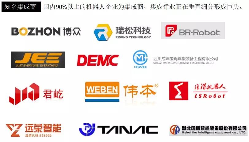 集成商:機器人集成商不生產機器人本體,定位為客戶提供機器人自動化生產線或工作站解決方案,從早期項目方案到機械和電氣設計,再到安裝調試,為客戶提供成套設備和技術服務,國內90%的機器人企業(yè)為集成商,目前趨于垂直細分,在每個行業(yè)逐漸形成巨頭,比如3C的博眾,杰士德,科瑞恩等,又如汽車焊裝的巨一,君屹,北人等企業(yè)。