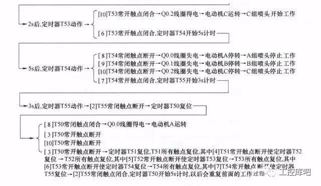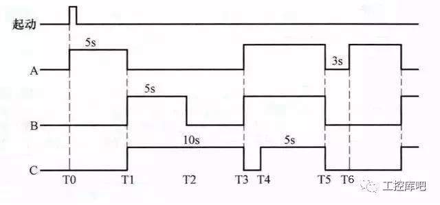當(dāng)按下起動按鈕后,A組噴頭先噴5s后停止,然后B、C組噴頭同時噴,5s后,B組噴頭停止、C組噴頭繼續(xù)噴5s再停止,而后A、B組噴頭噴7s,C組噴頭在這7s的前2s內(nèi)停止,后5s內(nèi)噴水,接著A、B、C三組噴頭同時停止3s,以后重復(fù)前述過程。按下停止按鈕后,三組噴頭同時停止噴水。下圖為A、B、C三組噴頭工作時序圖。