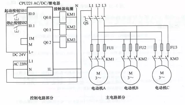 系統(tǒng)要求用兩個按鈕來控制A、B、C三組噴頭工作(通過控制三組噴頭的泵電動機(jī)來實現(xiàn)),三組噴頭排列如下圖所示。
