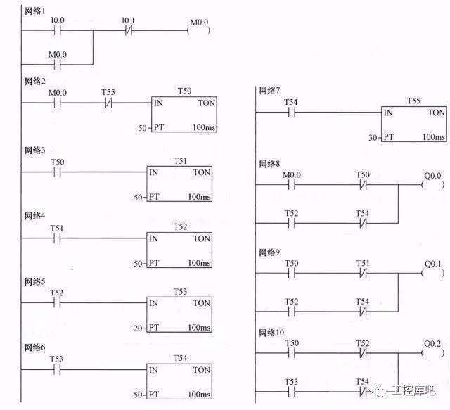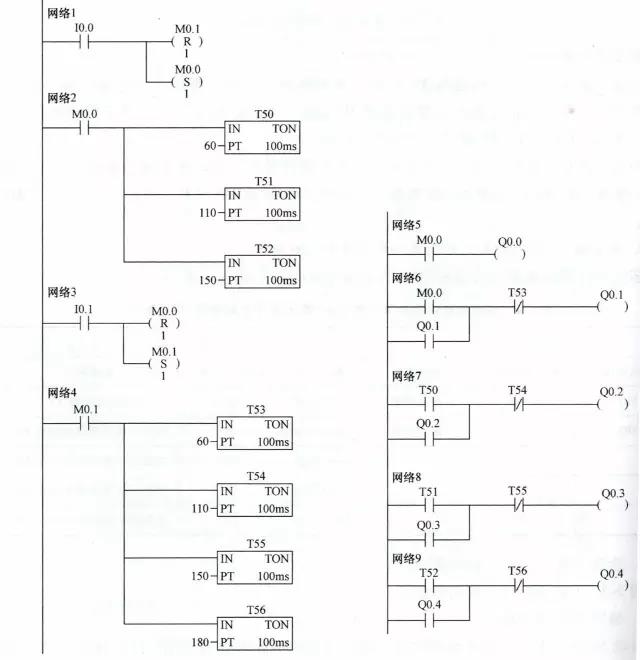 在上圖所示的梯形圖中,采用了一個特殊的輔助繼電器SM0.5,稱為觸點利用型特殊繼電器,它利用PLC自動驅(qū)動線圈,用戶只能利用它的觸點,即畫梯形圖里只能畫它的觸點。SM0.5能產(chǎn)生周期為1s的時鐘脈沖,其高低電平持續(xù)時間各為0.5s,以上圖梯形圖網(wǎng)絡(luò)9為例,當(dāng)T50常開觸點閉合,在1s內(nèi),SM0.5常閉觸點接通、斷開時間分別為0.5s,Q0.4線圈得電、失電時間也都為0.5s。