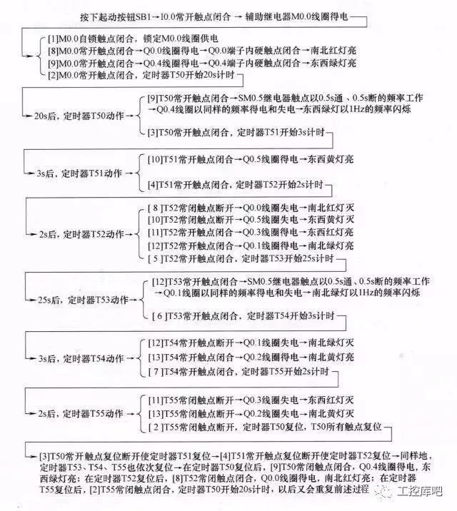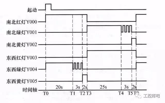 當(dāng)按下起動按鈕后,南北紅燈亮25s,在南北紅燈亮25s的時間里,東西綠燈先亮20s再以1次/s的頻率閃爍3次,接著東西黃燈亮2s,25s后南北紅燈熄滅,熄滅時間維持30s,在這30s時間里,東西紅燈一直亮,南北綠燈先亮25s,然后以1次/s頻率閃爍3次,接著南北黃燈亮2s。以后重復(fù)該過程。按下停止按鈕后,所有的燈都熄滅。交通信號燈的工作時序如下圖所示。