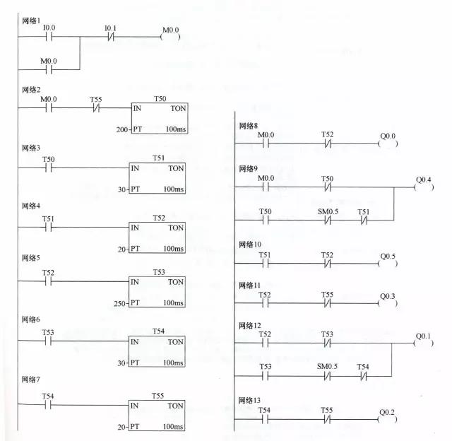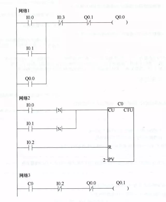 啟動STEP 7-Micro/WIN編程軟件,編寫滿足控制要求的梯形圖程序,編寫完成的梯形圖如下圖所示。