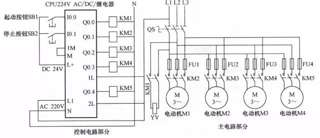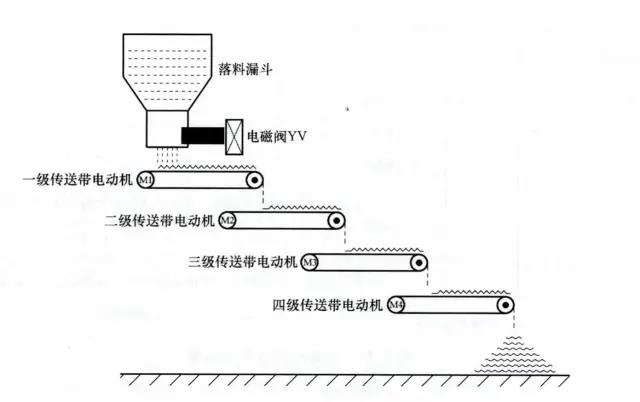 當(dāng)按下起動按鈕后,電磁閥YV打開,開始落料,同時一級傳送帶電動機(jī)M1起動,將物料往前傳送,6s后二級傳送帶電動機(jī)M2起動,M2起動5s后三極傳送帶電動機(jī)M3起動,M3起動后4s后四級傳送帶電動機(jī)M4起動。