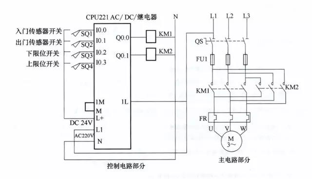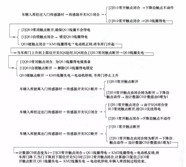 在車輛入庫經(jīng)過入門傳感器時,入門傳感器開關(guān)閉合,車庫門電動機(jī)正轉(zhuǎn),車庫門上升,當(dāng)車庫門上升到上限位開關(guān)處時,電動機(jī)停轉(zhuǎn);車輛進(jìn)庫經(jīng)過出門傳感器時,出門傳感器開關(guān)閉合,車庫門電動機(jī)反轉(zhuǎn),車庫門下降,當(dāng)車庫門下降到下限位開關(guān)處時,電動機(jī)停轉(zhuǎn)。