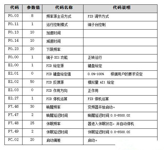 注:一般情況下,請(qǐng)?jiān)O(shè)置喚醒頻率大于等于休眠頻率。設(shè)定喚醒頻率和休眠頻率均為 0.00Hz,則休眠和喚醒功能無效。在啟用休眠功能時(shí),若頻率源使用 PID,則休眠狀態(tài) PID 是否運(yùn)算,受功能碼 E2.27 的影響,此時(shí)必須選擇 PID 停機(jī)時(shí)運(yùn)算(E2.27=1)。