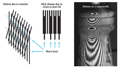 圖2.邊緣方向或間距變化的莫爾條紋圖案表示零件表面的傾斜或偏轉(zhuǎn),并隨著零件的移動固定在零件表面上。瓶子(右)上的標簽邊緣可以看作是通過制動器在標簽頂部的圖案中從表面上抬起。