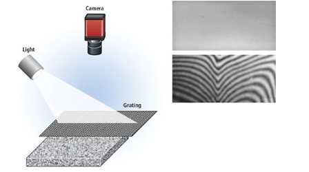 對于3D測量,這種摩爾圖案允許測量零件形狀的微小變化,對于簡單的結(jié)構(gòu)光系統(tǒng),該變化低于相機或傳感器的分辨率極限,因此無法測量。作為一種增強工具,摩爾圖案在輕柔彎曲的零件表面上產(chǎn)生直觀的圖案,增強了大多數(shù)簡單定向照明方法不可見的特征,并創(chuàng)建一個可以使用基本工具(如邊緣檢測器和許多智能相機中的模式匹配)進行定量解釋的模式。
