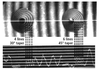 圖8顯示了兩個錐形為30°和45°的孔。使用莫爾紋增強圖像可以通過計算從孔中心到邊緣的線來識別使用的錐度。