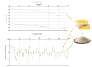 圖4:大米和小米的光譜響應(yīng)曲線以及經(jīng)過二階導(dǎo)數(shù)處理后的曲線。(圖片來源:艾邁斯半導(dǎo)體)