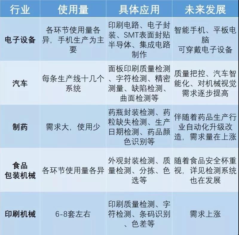 電子、汽車、冶金、食品飲料、零配件裝配及制造等行業(yè)。隨著國內(nèi)制造業(yè)的快速發(fā)展,對于產(chǎn)品檢測和質(zhì)最的要求不斷提高,各行各業(yè)對圖像和機器視覺技術的工業(yè)自動需求將越來越大,因此機器視覺在未來制造業(yè)中將會有很大的發(fā)展空間。