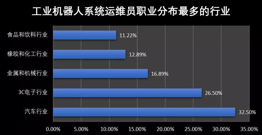 工業(yè)機(jī)器人系統(tǒng)運(yùn)維員職業(yè)從業(yè)工作人員中32.5%是在汽車制造行業(yè)就職的,26.5%是在3C電子行業(yè),16.89%是在金屬和機(jī)械行業(yè),12.89%是在橡膠和化工行業(yè),11.22%是在食品和飲料行業(yè)就職,同時(shí)這些行業(yè)也是國(guó)內(nèi)工業(yè)機(jī)器人應(yīng)用最廣泛制造行業(yè)。