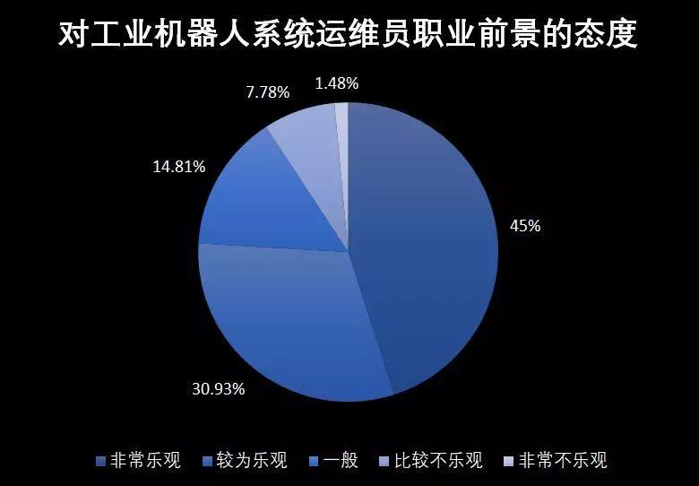 84.93%工業(yè)機(jī)器人系統(tǒng)運(yùn)維員職業(yè)從業(yè)人員中對(duì)自己的職業(yè)前景是抱樂(lè)觀態(tài)度的,可見(jiàn)這個(gè)職業(yè)的離職率和轉(zhuǎn)崗率是很低的。