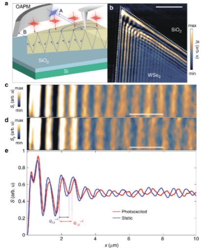 a:實(shí)驗(yàn)示意圖(藍(lán)色為Probe光,紅色為Pump光);b:近場(chǎng)納米光學(xué)成像 c: 在穩(wěn)態(tài)下,WSe2邊緣的近場(chǎng)光學(xué)振幅圖像;d: 光激發(fā)態(tài)下,延遲時(shí)間 Δt=1ps的WSe2邊緣的近場(chǎng)光學(xué)振幅圖像;e: 分別對(duì)c、d進(jìn)行截面分析,獲取定量數(shù)據(jù)。Probe探測(cè)能量,E=1.45 eV