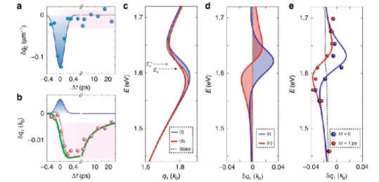 為了弄清各種瞬態(tài)機(jī)制,微分色散關(guān)系被研究者引入。首先,研究者定義了微分關(guān)系:δqj=qj,p – qj,r,(j=1,2 分別代表波矢的實(shí)部和虛部,p, pump激發(fā)態(tài),r 穩(wěn)態(tài))。研究者的理論及實(shí)驗(yàn)微分色散關(guān)系結(jié)果(圖3 d、e)成功顯示了光誘導(dǎo)轉(zhuǎn)變中A-exciton的動(dòng)力學(xué)行為。結(jié)果表明:A-exciton附近微分色散的特征是由兩個(gè)伴隨效應(yīng)引起的:(i)僅在Δt=0時(shí)觀察到的A-exciton的7 meV藍(lán)移;(ii)A-exciton的漂白(定義為光譜頻譜展寬和/或振蕩強(qiáng)度降低(見(jiàn)圖3d)。趨勢(shì)(i)在1 ps內(nèi)恢復(fù),與抑制耗散的動(dòng)力學(xué)一致(圖3a)。因此,研究者得出結(jié)論,A-exciton共振的瞬態(tài)藍(lán)移是由于相干的光誘導(dǎo)過(guò)程所引起。趨勢(shì)(ii)持續(xù)時(shí)間更長(zhǎng),因此歸因于非相干激子動(dòng)力學(xué)。