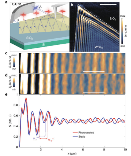 在納米空間分辨超快光譜和成像(tr-SNOM)實驗中(圖1,a),研究者首先將Probe探測光(藍色)照到原子力顯微鏡(AFM)探針尖端的頂點上,從探針尖端頂點(光束A)散射回的光被離軸拋物面鏡(OAPM)收集并發(fā)送到檢測器。同時,WSe2材料的中的波導(dǎo)被激發(fā)并傳播到樣品邊緣后,進而波導(dǎo)被散射到自由空間(光束B)。第二個Pump泵通道(紅色)可均勻地擾動樣本并改變波導(dǎo)的傳播。通過在WSe2/SiO2界面處的近場tr-SNOM的振幅圖像(圖1b)可明顯觀察到約120 nm厚WSe2材料邊緣(白色虛線)處形成的特征周期條紋—光波導(dǎo)電場分布。研究者進一步通過定量分析數(shù)據(jù),分別獲取了穩(wěn)態(tài)和光激發(fā)態(tài)下,WSe2中波導(dǎo)的光波導(dǎo)的相速度q1,r和q1,p。
