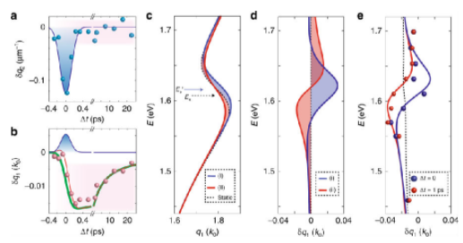 為了弄清各種瞬態(tài)機制,微分色散關(guān)系被研究者引入。首先,研究者定義了微分關(guān)系:δqj=qj,p – qj,r,(j=1,2 分別代表波矢的實部和虛部,p, pump激發(fā)態(tài),r 穩(wěn)態(tài))。研究者的理論及實驗微分色散關(guān)系結(jié)果(圖3 d、e)成功顯示了光誘導(dǎo)轉(zhuǎn)變中A-exciton的動力學(xué)行為。結(jié)果表明:A-exciton附近微分色散的特征是由兩個伴隨效應(yīng)引起的:(i)僅在Δt=0時觀察到的A-exciton的7 meV藍移;(ii)A-exciton的漂白(定義為光譜頻譜展寬和/或振蕩強度降低(見圖3d)。趨勢(i)在1 ps內(nèi)恢復(fù),與抑制耗散的動力學(xué)一致(圖3a)。因此,研究者得出結(jié)論,A-exciton共振的瞬態(tài)藍移是由于相干的光誘導(dǎo)過程所引起。趨勢(ii)持續(xù)時間更長,因此歸因于非相干激子動力學(xué)。