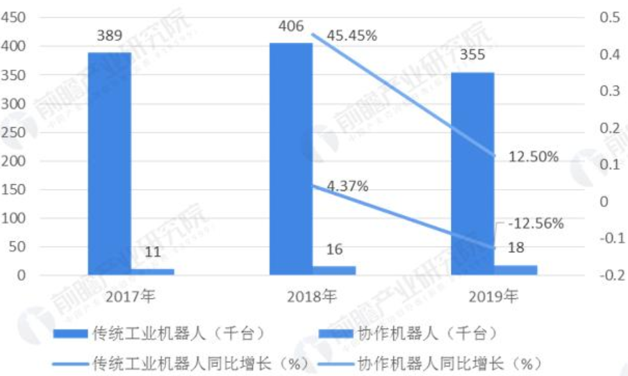 工業(yè)機(jī)器人又分為傳統(tǒng)工業(yè)機(jī)器人(非人機(jī)協(xié)作)以及協(xié)作機(jī)器人,其中全球傳統(tǒng)工業(yè)機(jī)器人在2019年出貨量達(dá)到35.5萬(wàn)臺(tái),同比下降12.56%;全球協(xié)作機(jī)器人出貨量1.8萬(wàn)臺(tái),在低基數(shù)之下同比上升12.50%。