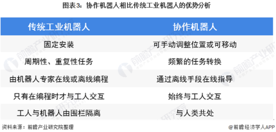 傳統(tǒng)工業(yè)機(jī)器人由于價(jià)格昂貴,生產(chǎn)周期長(zhǎng)無(wú)法滿足中小企業(yè)需求,而協(xié)作機(jī)器人具有較低的綜合成本、快速部署/重部署能力、簡(jiǎn)單上手的使用方法等優(yōu)點(diǎn),是未來(lái)機(jī)器人產(chǎn)業(yè)大力發(fā)展方向。