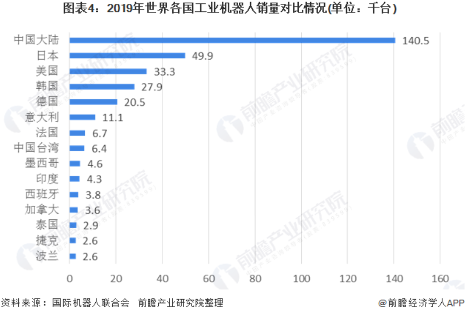 2019年, 中國(guó)大陸工業(yè)機(jī)器人銷(xiāo)量達(dá)到了14.05萬(wàn)臺(tái),其占全球銷(xiāo)量的37.67%,成為全球工業(yè)機(jī)器人供應(yīng)的第一大國(guó)。日本、美國(guó)、韓國(guó)和德國(guó)工業(yè)機(jī)器人銷(xiāo)量分別為4.99萬(wàn)臺(tái)、3.33萬(wàn)臺(tái)、2.79萬(wàn)臺(tái)和2.05萬(wàn)臺(tái),分別占全球銷(xiāo)量的13.38%、8.93%、7.48%和5.50%。