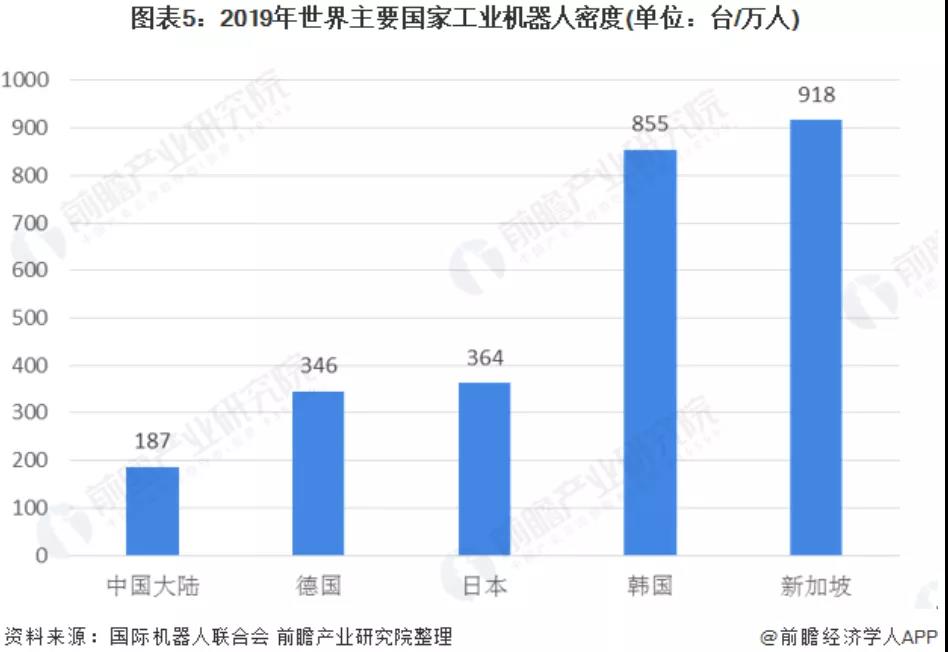 近年來(lái),世界主要國(guó)家工業(yè)機(jī)器人密度均有所提升。2019年,中國(guó)大陸的工業(yè)機(jī)器人密度(工業(yè)機(jī)器人保有量/IFR統(tǒng)計(jì)的制造業(yè)就業(yè)人數(shù))達(dá)到了187臺(tái)/萬(wàn)人,相較2018年的140臺(tái)/萬(wàn)人有了明顯提升。我國(guó)工業(yè)機(jī)器人密度提升主要是由工業(yè)機(jī)器人保有量的提升與制造業(yè)從業(yè)人員數(shù)量的下降兩項(xiàng)因素疊加共同帶動(dòng)的。但是我國(guó)工業(yè)機(jī)器人密度與傳統(tǒng)工業(yè)強(qiáng)國(guó)德國(guó)、日本、韓國(guó)、新加坡等仍有較大差距,僅相當(dāng)于日本的二分之一左右,相當(dāng)于新加坡的五分之一左右。