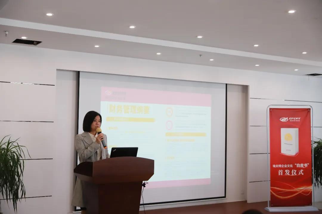 埃夫特財務(wù)總監(jiān)吳奕斐為小伙伴們帶來了《企業(yè)文化白皮書》財務(wù)管理綱要的講解和分享,從財務(wù)管理目的、準則及有效路徑等幾個方面詮釋了財務(wù)管理的要義,并從全球化的財務(wù)治理體系,數(shù)字化、智能化的財務(wù)經(jīng)營管理等方面描述、解讀了財務(wù)板塊的核心理念。
