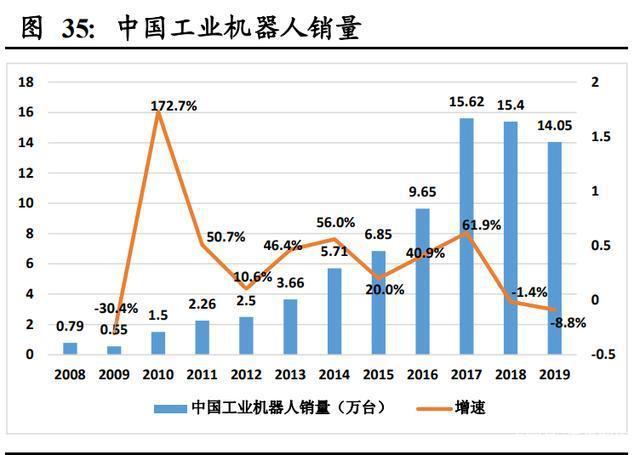 2018年和2019年受宏觀經(jīng)濟(jì)下滑和中美貿(mào)易摩擦的影響,中國工業(yè)機(jī)器人銷量增速有所停滯。