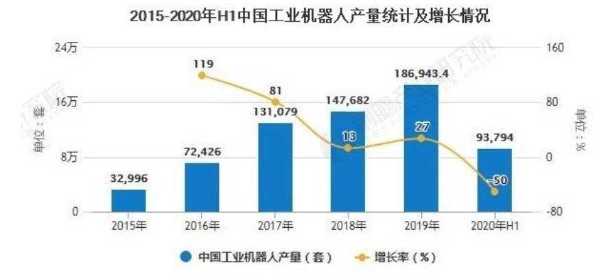 2020年上半年工業(yè)機(jī)器人產(chǎn)量出現(xiàn)負(fù)增長(zhǎng)。受疫情影響,國內(nèi)汽車、電子等機(jī)器人下游行業(yè)發(fā)展受限,機(jī)器人需求增速放緩。
