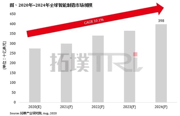 智能制造是基于新一代信息通信技術(shù)與先進制造技術(shù)深度融合,貫穿于設(shè)計、生產(chǎn)、管理、服務(wù)等制造活動的各個環(huán)節(jié),具有自感知、自學習、自決策、自執(zhí)行和自適應(yīng)功能的新型生產(chǎn)方式。其核心是有效利用數(shù)據(jù)來改進和自動做出決策、預測和實時行動,優(yōu)化工業(yè)產(chǎn)出。根據(jù)集邦咨詢(TrendForce)旗下拓墣產(chǎn)業(yè)研究院表示,預估2024年全球智能制造市場規(guī)模將達到4000億美元,年復合增長率達10.1%。