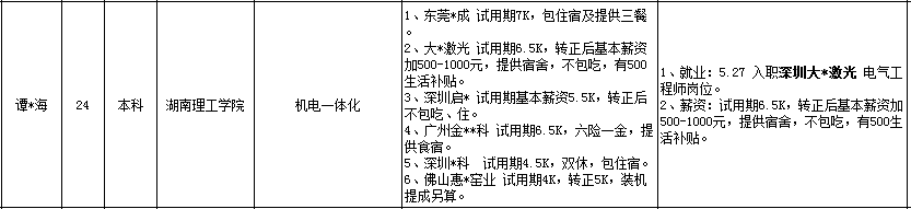 譚*海同學,24歲,湖南理工學院機電一體化本科畢業(yè),工作經(jīng)驗一年。本次他共面試了8家企業(yè),被其中6家企業(yè)錄取,經(jīng)過考慮他選擇了大族激光電氣工程師一職,轉(zhuǎn)正工資7500元,并有500元生活補貼,出差及加班費另算。