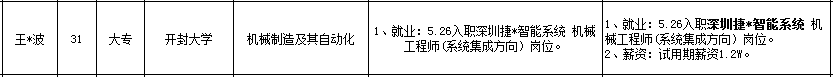 王*波同學,31歲,開封大學機械制造及其自動化大專學歷,9年工作經(jīng)驗,之前從事機械設(shè)計相關(guān)工作,但工作一直找不到突破口,通過學習工業(yè)機器人系統(tǒng)集成課程,成功入職深圳捷訊智能系統(tǒng)機械工程師(系統(tǒng)集成方向),試用期工資高達12000元。