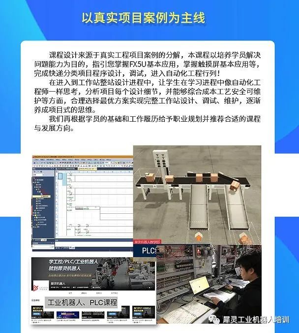 犀靈機(jī)器人在過(guò)去五年多培養(yǎng)了超過(guò)10000名以上電氣自動(dòng)化工程師,結(jié)合我們多年的線下教學(xué)經(jīng)驗(yàn),我們發(fā)現(xiàn),純以理論基礎(chǔ)的教學(xué)是無(wú)法培養(yǎng)出符合企業(yè)需求的學(xué)員,為此,我們的FX5U-快遞分類項(xiàng)目線上培訓(xùn)課程以項(xiàng)目案例教學(xué)、重點(diǎn)培養(yǎng)學(xué)員的動(dòng)手解決能力為目標(biāo)。我們始終堅(jiān)定一個(gè)目標(biāo):培養(yǎng)適合企業(yè)需求的技能型人才。