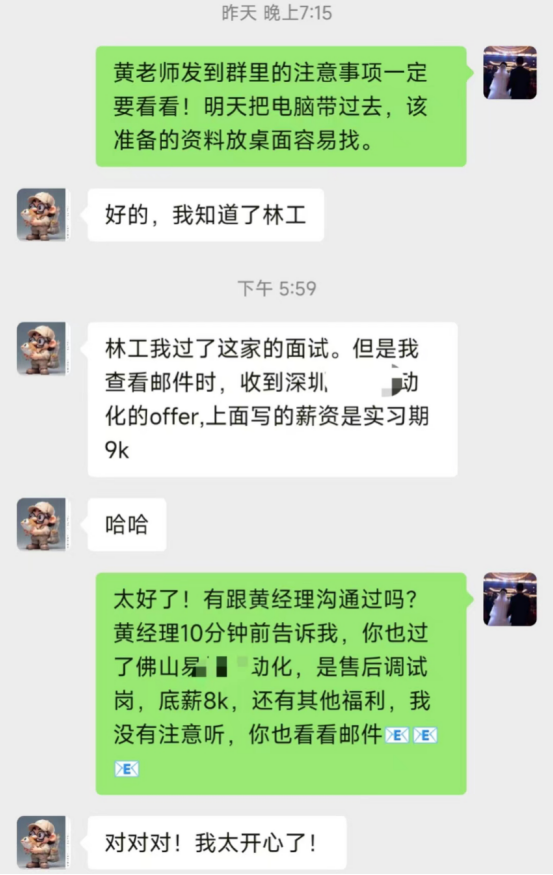 后面的談薪環(huán)節(jié)也和就業(yè)經(jīng)理一起溝通了一下,順利接到3家企業(yè)的電氣工程師、電氣助理工程師、售后調(diào)試郵件offer,其中我選擇了深圳一家做整廠設(shè)計(jì)方案的乙方企業(yè),崗位是電氣工程師。實(shí)習(xí)期9K。這個(gè)薪資我還是比較滿意的,而且不得不說(shuō),剛畢業(yè)就能找到工作的感覺(jué),真的賊好!這些是犀靈機(jī)器人帶給我的能力、勇氣和底氣。